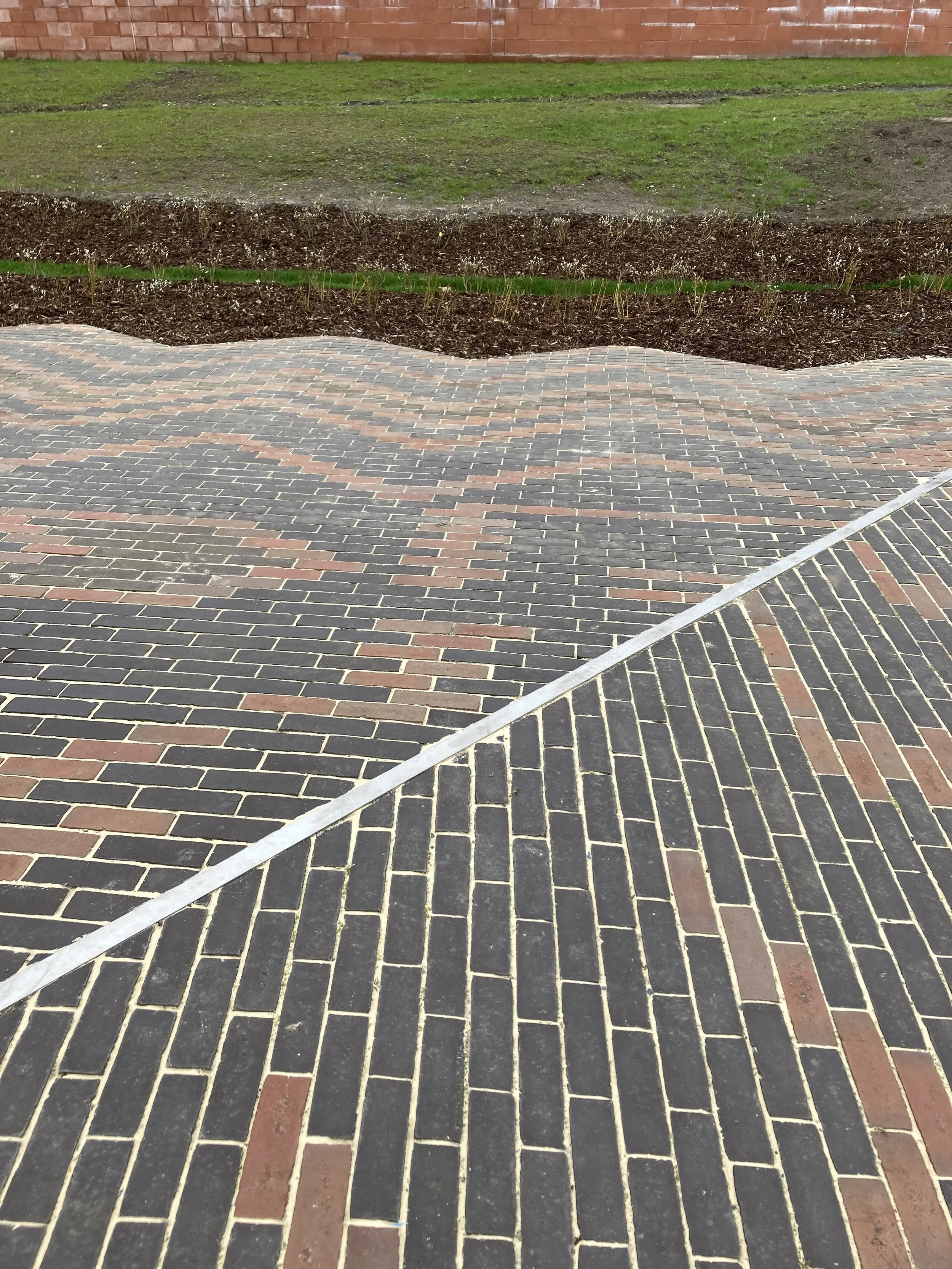 Floor pattern brickwork and sculptural beacon on a large new public space in Glasgow’s east end, 2021
