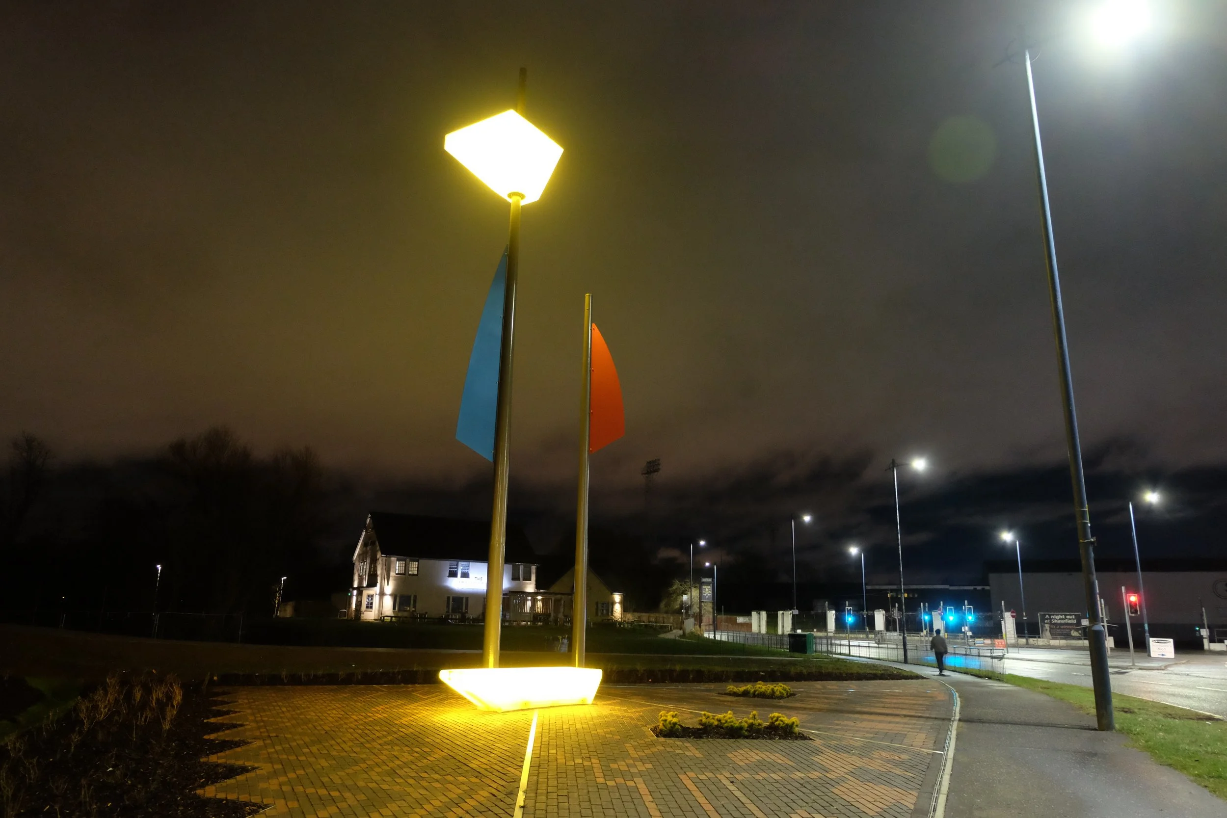 The sculpture is lit up at night bringing a glowing atmosphere to the public space.
